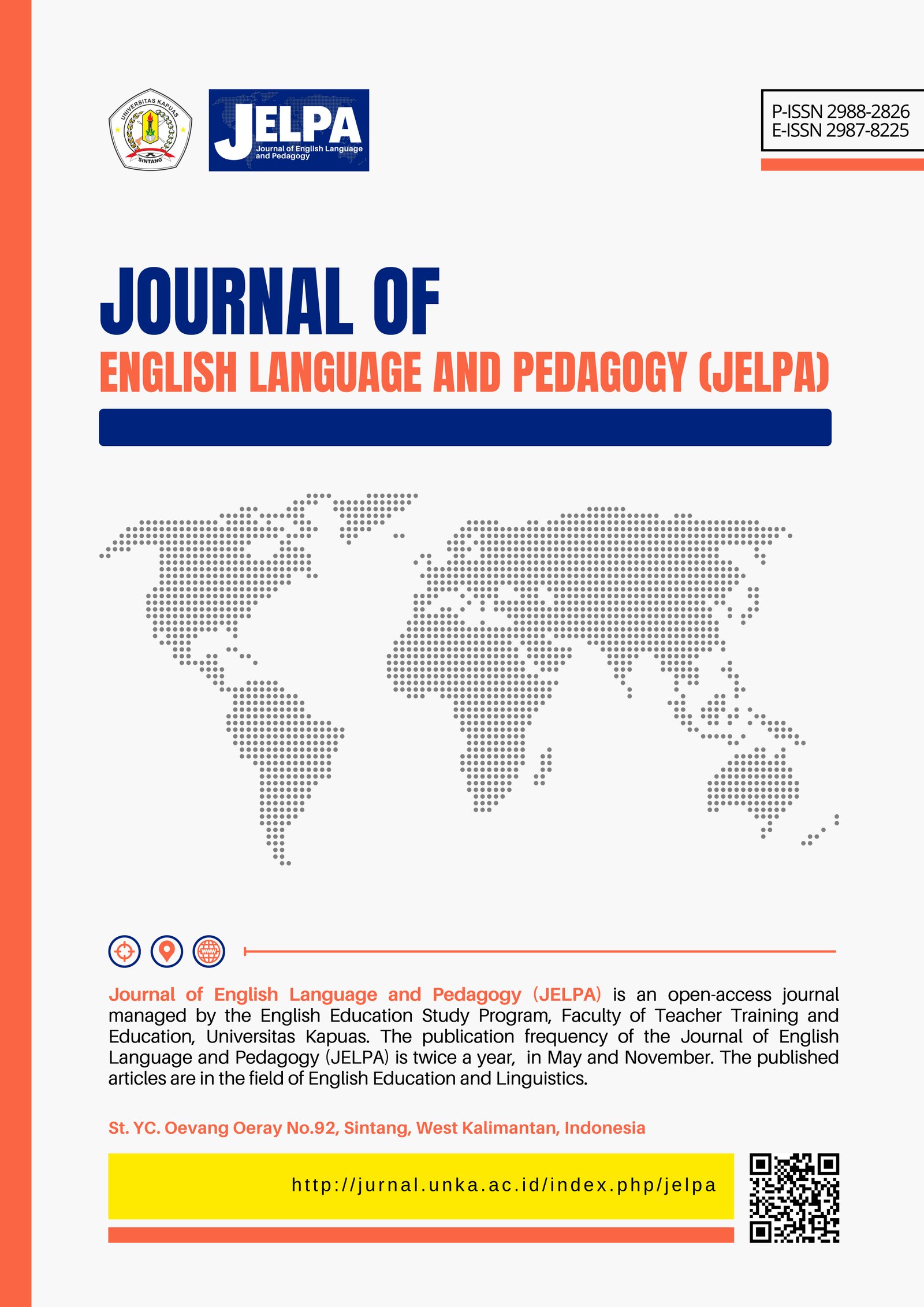 Journal of English Language and Pedagogy (JELPA) is an open-access journal published by the English Education Study Program, Faculty of Teacher Training and Education of Universitas Kapuas. The journal is published twice a year, in May and November. It primarily focuses on articles related to English Education and Applied Linguistics. JELPA aims to provide a platform for scholars and researchers to share their insights and findings in these fields. The journal's commitment to open access ensures that valuable research is accessible to a wide audience.