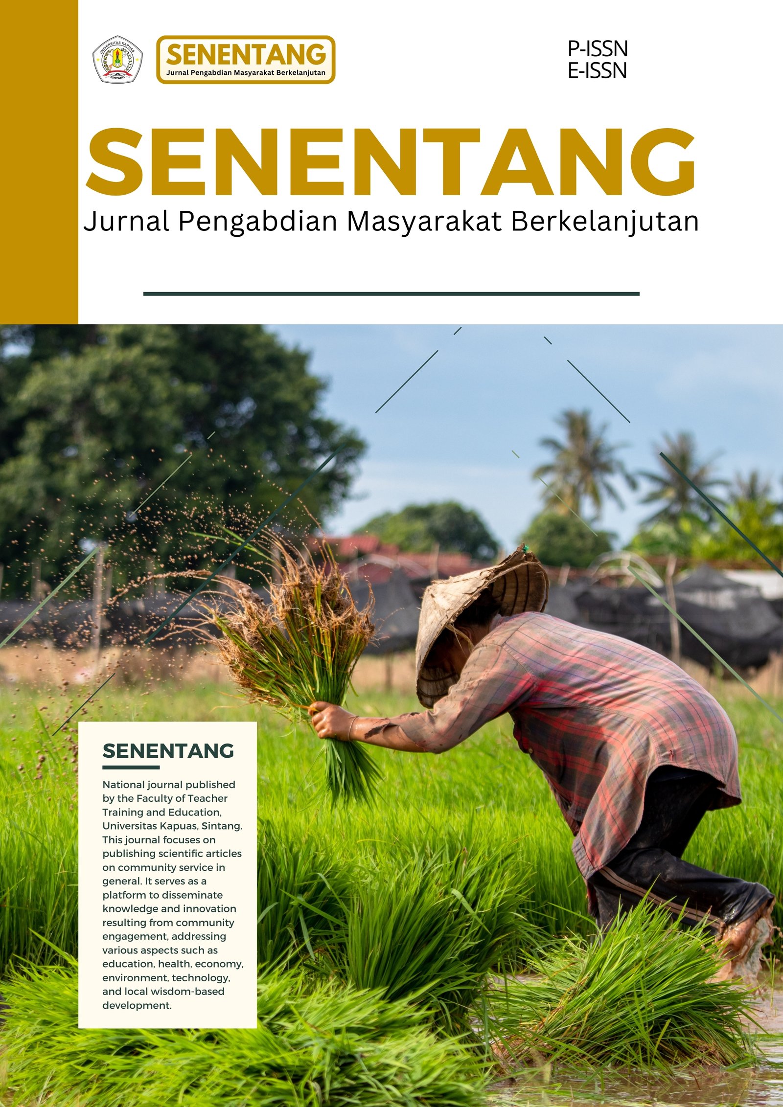 Senentang: Jurnal Pengabdian Masyarakat Berkelanjutan is a national journal published by the Faculty of Teacher Training and Education, Universitas Kapuas, Sintang. This journal focuses on publishing scientific articles on community service in general. It serves as a platform to disseminate knowledge and innovation resulting from community engagement, addressing various aspects such as education, health, economy, environment, technology, and local wisdom-based development.