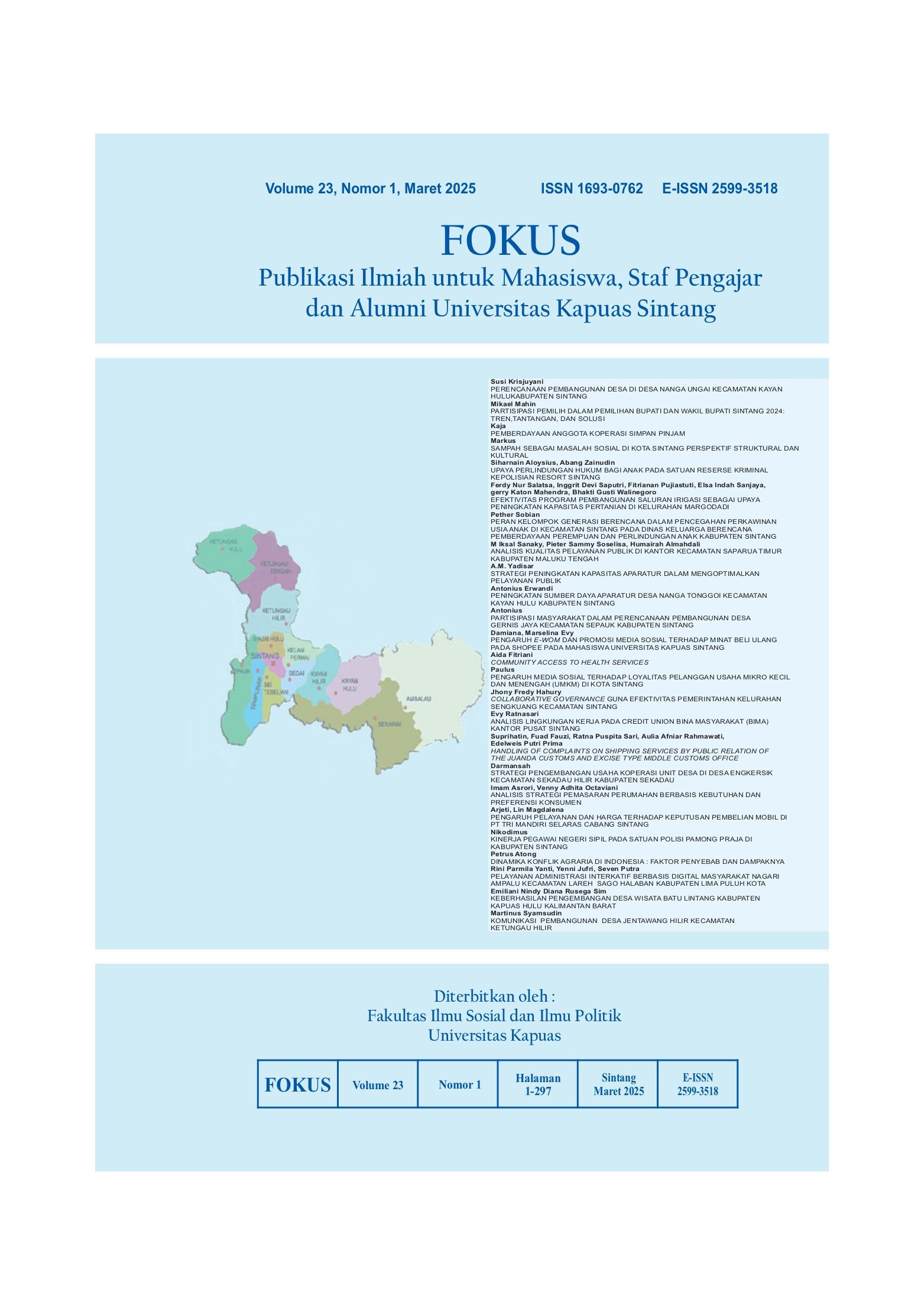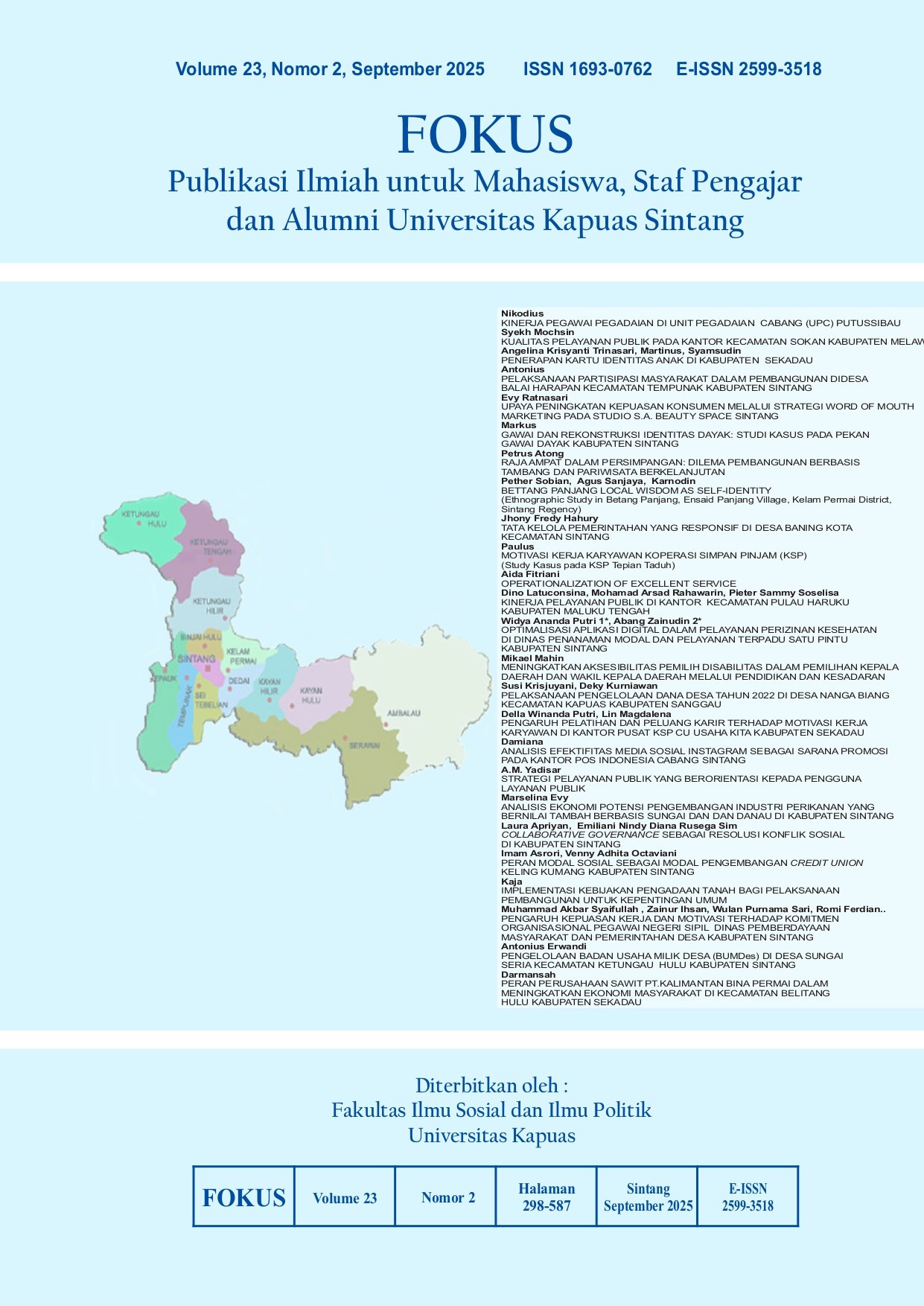 Vol. 23 No. 2 (2025)FOKUS (Publikasi Ilmiah untuk Mahasiswa, Staf Pengajar dan Alumni Universitas Kapuas Sintang) adalah Jurnal Ilmiah yang didedikasikan untuk mempublikasikan dan menyebarluaskan hasil penelitian, inovasi, dan pengembangan di bidang Ilmu Administrasi yaitu Adminitrasi Publik dan Administrasi Bisnis yang diterbitkan oleh Fakultas Ilmu Sosial dan Ilmu Politik Universitas Kapuas Sintang. FOKUS terbit 2 kali dalam setahun (Maret dan September) dengan e-ISSN 2599-3518 (online) dan p-ISSN 1693-0762 (print). FOKUS memuat artikel dan karya ilmiah baik berupa hasil penelitian maupun non penelitian. FOKUS bertujuan untuk menyebarluaskan pemikiran atau gagasan konseptual dan hasil penelitian yang telah dicapai di bidang Ilmu Administrasi yaitu Administrasi Publik dan Administrasi Bisnis. FOKUS secara khusus menitikberatkan pada permasalahan pokok dalam pengembangan Ilmu Administrasi yaitu Administrasi Publik dan Administrasi Bisnis.