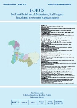 Vol. 20 No. 2 (2022)FOKUS (Publikasi Ilmiah untuk Mahasiswa, Staf Pengajar dan Alumni Universitas Kapuas Sintang) adalah Jurnal Ilmiah yang didedikasikan untuk mempublikasikan dan menyebarluaskan hasil penelitian, inovasi, dan pengembangan di bidang Ilmu Administrasi yaitu Adminitrasi Publik dan Administrasi Bisnis yang diterbitkan oleh Fakultas Ilmu Sosial dan Ilmu Politik Universitas Kapuas Sintang. FOKUS terbit 2 kali dalam setahun (Maret dan September) dengan e-ISSN 2599-3518 (online) dan p-ISSN 1693-0762 (print). FOKUS memuat artikel dan karya ilmiah baik berupa hasil penelitian maupun non penelitian. FOKUS bertujuan untuk menyebarluaskan pemikiran atau gagasan konseptual dan hasil penelitian yang telah dicapai di bidang Ilmu Administrasi yaitu Administrasi Publik dan Administrasi Bisnis. FOKUS secara khusus menitikberatkan pada permasalahan pokok dalam pengembangan Ilmu Administrasi yaitu Administrasi Publik dan Administrasi Bisnis. Jurnal ini berfokus pada kajian teoritis dan praktis diantaranya