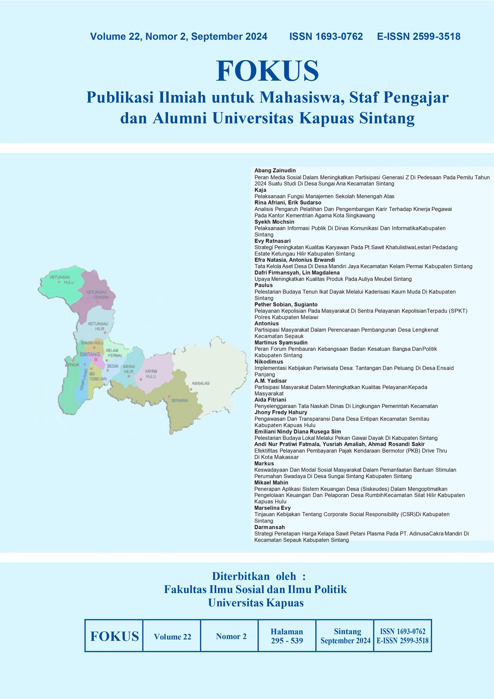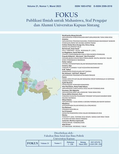 Vol. 22 No. 2 (2024)FOKUS (Scientific Publication for Students, Teaching Staff and Alumni of Kapuas University Sintang) is a Scientific Journal dedicated to publishing and disseminating the results of research, innovation, and development in the field of Administrative Sciences namely Public Administration and Business Administration published by the Faculty of Social and Political Sciences of Kapuas University Sintang.