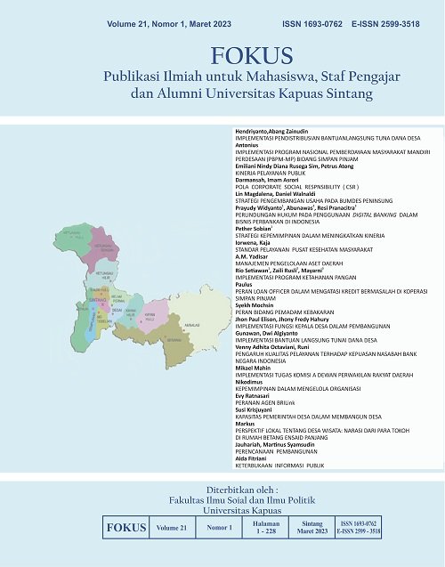 Vol. 23 No. 1 (2025)FOKUS (Publikasi Ilmiah untuk Mahasiswa, Staf Pengajar dan Alumni Universitas Kapuas Sintang) adalah Jurnal Ilmiah yang didedikasikan untuk mempublikasikan dan menyebarluaskan hasil penelitian, inovasi, dan pengembangan di bidang Ilmu Administrasi yaitu Adminitrasi Publik dan Administrasi Bisnis yang diterbitkan oleh Fakultas Ilmu Sosial dan Ilmu Politik Universitas Kapuas Sintang. FOKUS terbit 2 kali dalam setahun (Maret dan September) dengan e-ISSN 2599-3518 (online) dan p-ISSN 1693-0762 (print). FOKUS memuat artikel dan karya ilmiah baik berupa hasil penelitian maupun non penelitian. FOKUS bertujuan untuk menyebarluaskan pemikiran atau gagasan konseptual dan hasil penelitian yang telah dicapai di bidang Ilmu Administrasi yaitu Administrasi Publik dan Administrasi Bisnis. FOKUS secara khusus menitikberatkan pada permasalahan pokok dalam pengembangan Ilmu Administrasi yaitu Administrasi Publik dan Administrasi Bisnis.