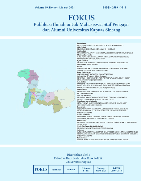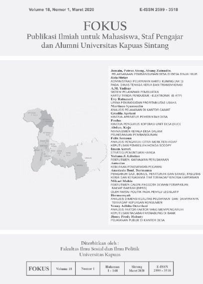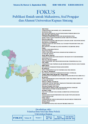 Vol. 19 No. 1 (2021)FOKUS (Publikasi Ilmiah untuk Mahasiswa, Staf Pengajar dan Alumni Universitas Kapuas Sintang) adalah Jurnal Ilmiah yang didedikasikan untuk mempublikasikan dan menyebarluaskan hasil penelitian, inovasi, dan pengembangan di bidang Ilmu Administrasi yaitu Adminitrasi Publik dan Administrasi Bisnis yang diterbitkan oleh Fakultas Ilmu Sosial dan Ilmu Politik Universitas Kapuas Sintang. FOKUS terbit 2 kali dalam setahun (Maret dan September) dengan e-ISSN 2599-3518 (online) dan p-ISSN 1693-0762 (print). FOKUS memuat artikel dan karya ilmiah baik berupa hasil penelitian maupun non penelitian. FOKUS bertujuan untuk menyebarluaskan pemikiran atau gagasan konseptual dan hasil penelitian yang telah dicapai di bidang Ilmu Administrasi yaitu Administrasi Publik dan Administrasi Bisnis. FOKUS secara khusus menitikberatkan pada permasalahan pokok dalam pengembangan Ilmu Administrasi yaitu Administrasi Publik dan Administrasi Bisnis. Jurnal ini berfokus pada kajian teoritis dan praktis diantaranya