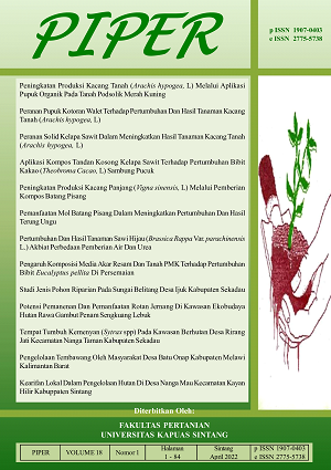 Vol. 15 No. 29 (2019)PIPER merupakan salah satu media/wadah untuk mengembangkan kemampuan ilmiah civitas akademika Fakultas Pertanian, terutama kemampuan berkomunikasi secara tertulis sesuai kaidah-kaidah ilmiah. Sebagai wadah menampung hasil-hasil penelitian ilmiah, PIPER dapat memperkaya khasanah ilmu dan pengetahuan melalui berbagai aktivitas penelitian. PIPER diharapkan berisi konsep-konsep pemikiran yang objektif, kritis, maju, konstruktif dan mengandung upaya memecahkan berbagai masalah sektor pertanian terutama di wilayah Kabupaten Sintang, Kalimantan Barat maupun di Indonesia bahkan dunia.
